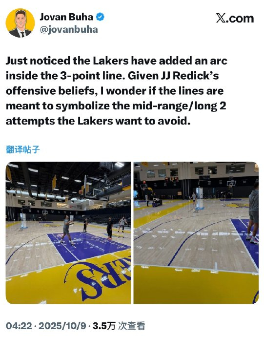 球馆里多出条弧线,不是什么小聪明或者花架子。雷迪克打法来了,这位老将一贯强调效率,坚决减少中距离长两分。在这个数据至上的时代,敢打中距离长两分简直输不起,湖人通过场馆设计变相“教育”球员,属于用心良苦。